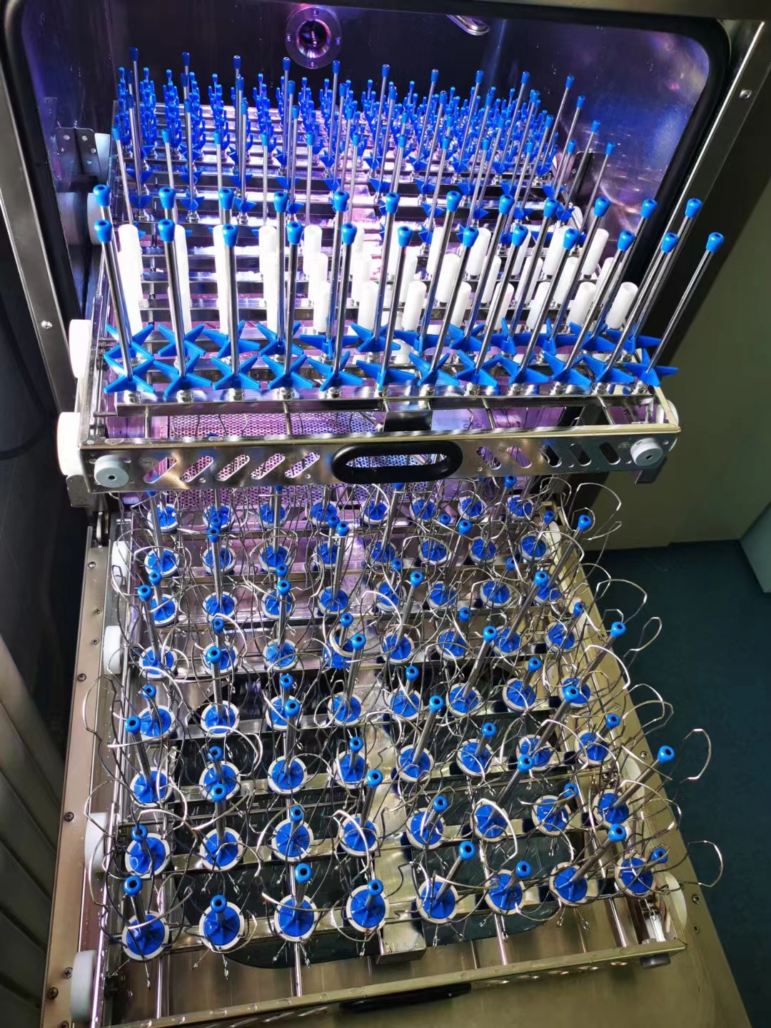 ④將器皿籃架推入清洗倉內,檢查噴管對位是否對中,噴臂是否轉動自如,噴淋架是否穩定,過濾網裝置是否安放妥當。
